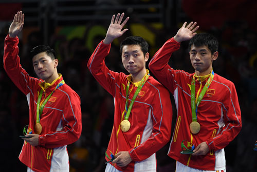 在2016年里約奧運會乒乓球男子團體賽決賽中,中國隊以3比1戰勝日本隊獲得金牌。 新華社記者 殷博古 攝