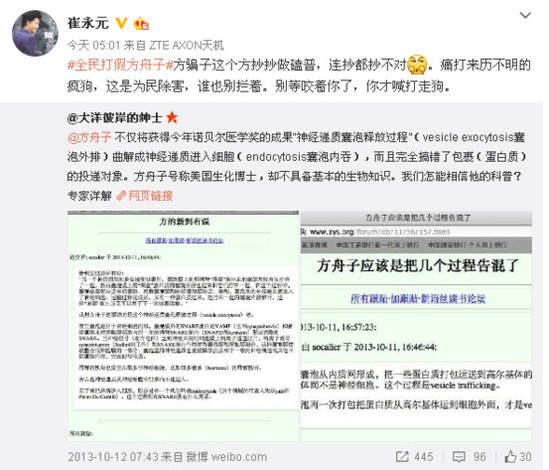 微博原文:#全民打假方舟子#方騙子這個(gè)方抄抄做磕普,連抄都抄不對(duì)。痛打來(lái)歷不明的瘋狗,這是為民除害,誰(shuí)也別攔著。別等咬著你了,你才喊打走狗。