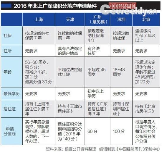 隨著北京《管理辦法》的出臺,至此,北京、上海、廣州、深圳、天津等市區(qū)常住人口超千萬的超大城市,均已提出或實施各自的積分落戶指標體系(見右上圖)。