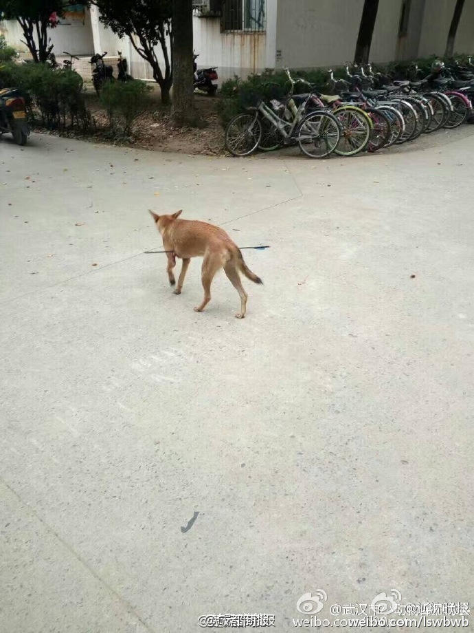 華科大校園內,一條流浪狗腹部被箭射穿,地上留著斑斑血跡。8月24日上午,這一張圖片牽動著上千網友的心,多名志愿者趕到華科大韻苑公寓,終于在一宿舍樓內找到了這條受傷的流浪狗。