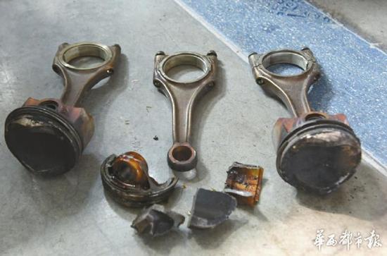 4日,龔勇(化名)的途銳汽車仍然停在4S店的維修車間。這輛車的發動機損壞嚴重:6缸壞了兩缸,兩根連桿已變形,其中一個活塞已碎裂成了無數個小碎片。