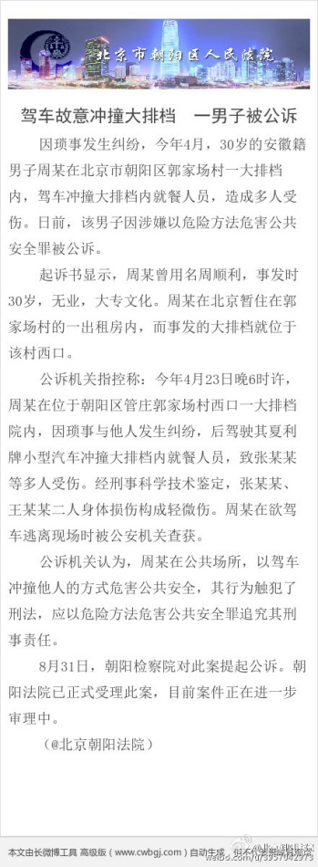 中新網9月8日電 據北京市朝陽區人民法院官方微博消息,因瑣事發生糾紛,今年4月,30歲的周某在北京市朝陽區郭家場村一大排檔內,駕車沖撞大排檔內就餐人員,造成多人受傷。日前,該男子因涉嫌以危險方法危害公共安全罪被公訴。