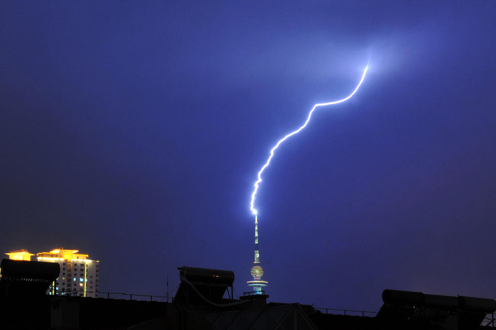 山東青島,受當晚雷陣雨影響,閃電多次擊中青島市電視塔。
