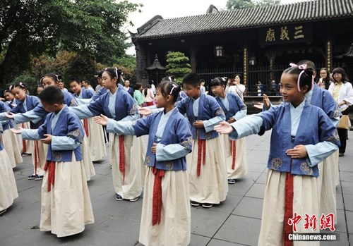 資料圖:中秋佳節(jié)成都學(xué)童著漢服推廣傳統(tǒng)文化。安源 攝