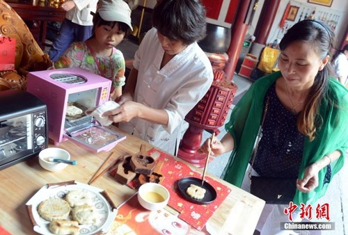 資料圖:中國(guó)傳統(tǒng)農(nóng)歷中秋佳節(jié),福州三坊七巷舉行中秋“撿月華”、制作“鯉魚餅”、拜月儀式等豐富多彩的傳統(tǒng)民俗活動(dòng),吸引眾多民眾前來(lái)體驗(yàn)中秋老民俗,歡度中秋“團(tuán)圓節(jié)”。劉可耕 攝