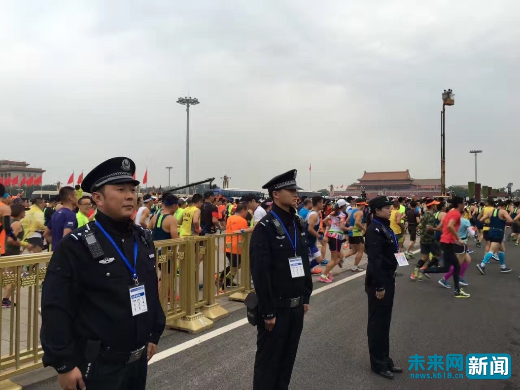 為確保2016年北京國際馬拉松賽絕對安全,北京警方整合民警、武警、保安員、志愿者四種力量1.5萬人,嚴格落實各項安保措施,確保賽事安全順利。(北京警方供圖)