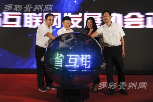 貴州省政協副主席陳海峰(左二),中央網信辦網絡社會工作局副局長孫愛萍(右二),貴州省委宣傳部副部長、省委網信辦主任謝念(右一),貴州省互聯網發展協會會長、多彩貴州網有限責任公司黨委書記、董事長晏世忠(左一)共同按亮預示貴州省互聯網發展協會成立的水晶球