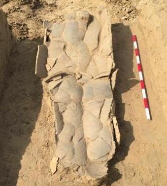 考古發(fā)掘現(xiàn)場遍布大大小小的墓坑,墓坑內(nèi)以甕、盆等陶器為葬具,2件或3件扣合在一起成為一具棺葬。來自河北省文物研究所、黃驊市博物館的考古人員已發(fā)掘兒童甕棺葬107座,成人甕棺葬6座。
