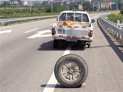 7日是國慶返程車流高峰,但駕駛員王某卻在回四川途中,在其駕駛的皮卡車右后輪跑脫后,并“就地取材”當成警示牌,所幸沒有造成道路交通事故。