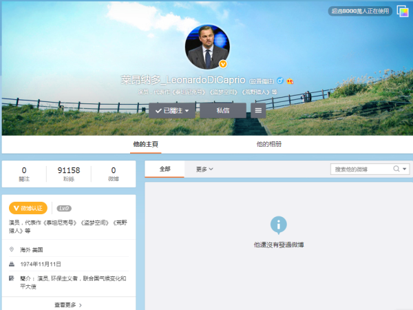 小李子的微博主頁空空如也,但不到三個小時,已經(jīng)粉絲超過10萬。(截圖來自@萊昂納多_LeonardoDiCaprio微博)