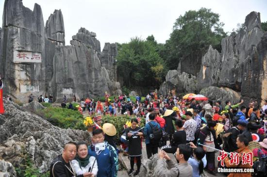 資料圖:10月1日,云南石林風景名勝區內游客扎堆拍照留念。中新社記者 任東 攝