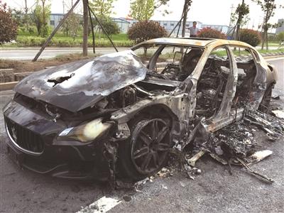 揚子晚報記者趕到現場看到,這輛瑪莎拉蒂已被燒成一具空殼,從車頭到車尾漆黑一團,沒有一處完整的地方。所有玻璃均被燒壞,蕩然無存;后備箱連帶蓋板被燒空,轎廂里燒得只剩鐵椅架;四只輪胎均被燒毀,前引擎蓋高高翹起,還被燒破了一個洞。透過縫隙,發(fā)動機部位凌亂不堪,各種部件及線路雜亂無章。記者只能從前面車頭處留存的一個大的車標判斷,它是一輛瑪莎拉蒂。而從前保險杠處殘留的漆面來判斷,它是一輛黑色的豪車。