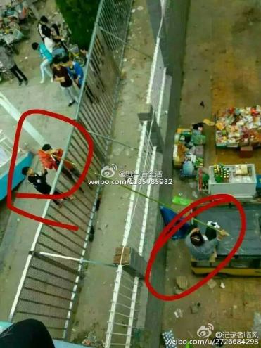 據(jù)@駐馬店生活消息,“自從去年冬天一個企業(yè)在泌陽縣第二高級中學(xué)蓋起食堂后,該校學(xué)生放學(xué)后自由出入校園、在校外購物、就餐的機(jī)會就被剝奪了。數(shù)千名學(xué)生的校園只保留一個小賣部,學(xué)生每日也只準(zhǔn)出入校園一次,且不得帶食物入校。”因不滿學(xué)校食堂的餐品及價格,許多學(xué)生選擇隔墻購買校外的食物。此種校外購食物的舉動,引起了學(xué)校不滿,為了迫使學(xué)生停止與校外商戶交易,校方不僅派老師,近期又花錢在原院墻外2米處,再焊起一圈鐵柵欄。于是,“長桿”隔雙墻交易的場景發(fā)生了。