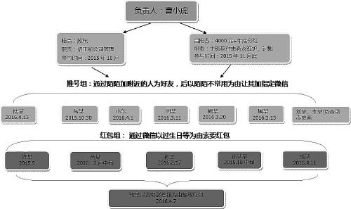 紅包組由5名女性成員組成,成員每天上班后,從呂陽青處領回一部預裝微信號的手機,然后通過微信以過生日、談男女朋友等名義索要紅包。該組成員之所以都為女性,是為防止對方要求語音聊天時穿幫。據紅包組成員錢某交代,該組每名成員一天下來至少能騙到500元,一天幾千元也是常有。最后加入“公司”的她,在短短16天時間內,就和同事一起詐騙了20余萬元。