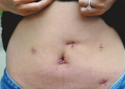 至此,鄭女士一共經(jīng)歷了三次手術(shù)。掀開上衣,鄭女士指著肚上多處縫合傷口說:“本來只有3個(gè)小孔,現(xiàn)在變成了6個(gè)洞,而且有3處打開、縫合了3次。”