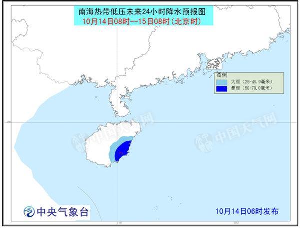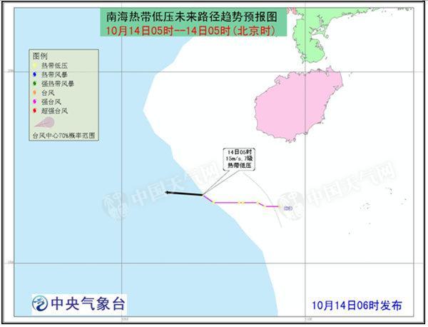 中國天氣網訊 中央氣象臺14日06時繼續發布熱帶低壓預報: