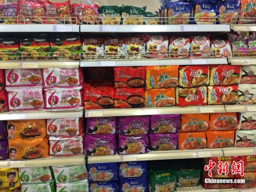 北京一家超市貨架上擺放的方便面。中新網邱宇 攝