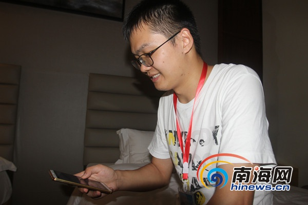 “全域旅游 海南范例——2016全國融媒體海南行”采訪團的媒體記者通過手機查看南海網了解臺風動向。 南海網記者陳望 攝