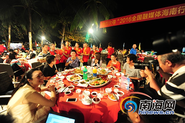 參加“全域旅游 海南范例——2016全國融媒體海南行”大型采訪活動的52家全國融媒體記者在三亞東海龍宮餐廳欣賞椰風海韻,品嘗地道海南美食。南海網記者 沙曉峰 攝