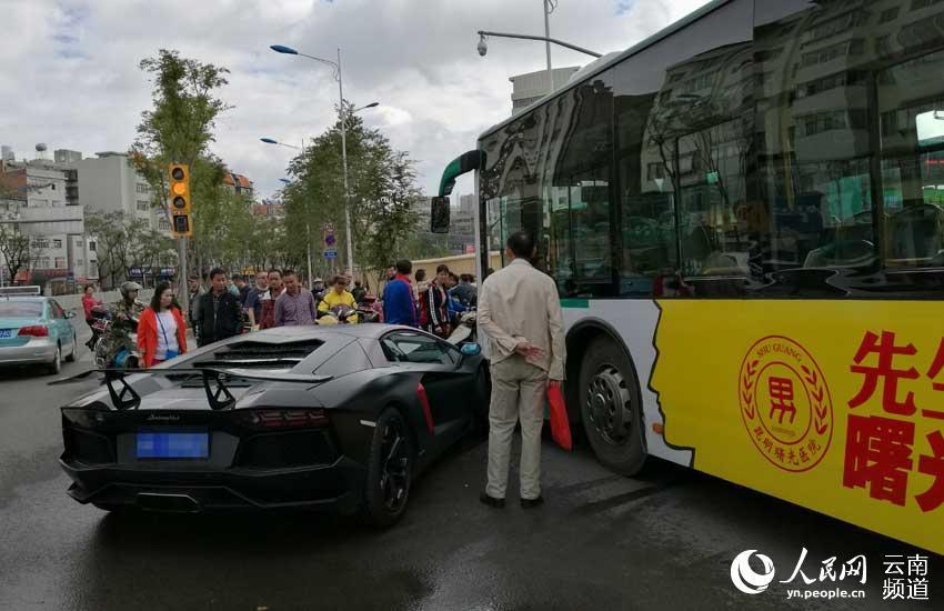 10月27日9時(shí)許,在昆明市西壩路與永樂路交叉口,發(fā)生一起公交車與蘭博基尼跑車相撞的交通事故,引得路過的市民駐足圍觀。目前交警已趕往現(xiàn)場(chǎng)處理,交通事故原因待進(jìn)一步調(diào)查。記者 徐元鋒 圖片來源:人民網(wǎng)
