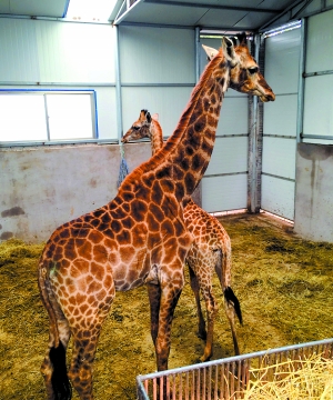 廣州日報訊 (記者曾毅攝影報道)日前,經過連續幾天的長途運輸,2只長頸鹿寶寶來到了順德長鹿童話動物園,園方出動一輛200噸級大吊車將長頸鹿搬進鹿鹿之家。