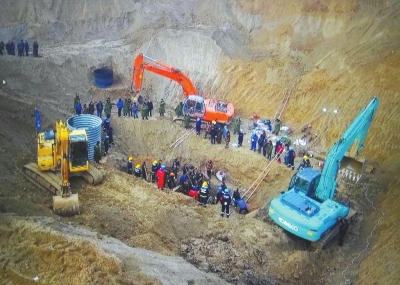挖掘機(jī)緊張作業(yè),搜救人員在井口持續(xù)救援。