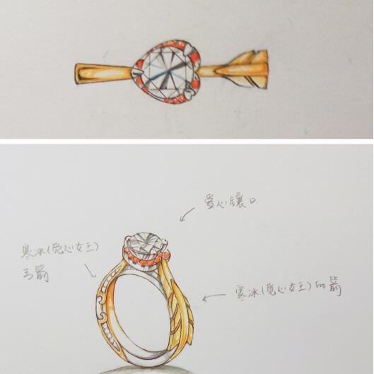 這次她只是在微博上艾特了小伙,說用兩人的愛情故事定制婚戒,更用心更有紀念意義,因為婚戒只屬于兩個人,不想和第三個人撞款。沒想到小伙子立刻帶上全部積蓄,拉著自己到店里,用兩人的愛情故事以及她最喜歡的游戲人物覓心女王為設計元素,定制名為“一箭穿心”求婚鉆戒。