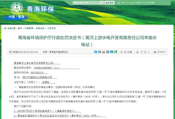 2015年7月14日,青海省環境保護廳下達了《責令改正違法行為決定書》,責令黃河上游水電開發有限責任公司于當年12月31日前完成“三通一平”工程環境影響評價文件審批。