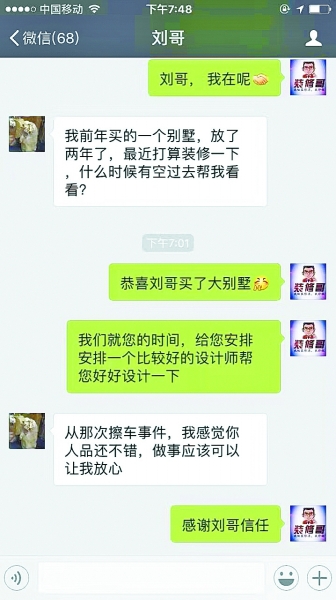 這兩年多,兩人的聯系只停留在簡單的朋友圈“點贊”和節日問候,直到最近劉向南準備裝修自己的別墅。“裝修就怕被坑,找個人品好的裝修老板比什么都重要。”劉向南說,他的裝修預算在80萬元左右,沒有考慮其他任何一家裝修公司,直接找了鐘明金。他跟妻子說了擦車事件后,妻子二話沒說,支持他的決定。