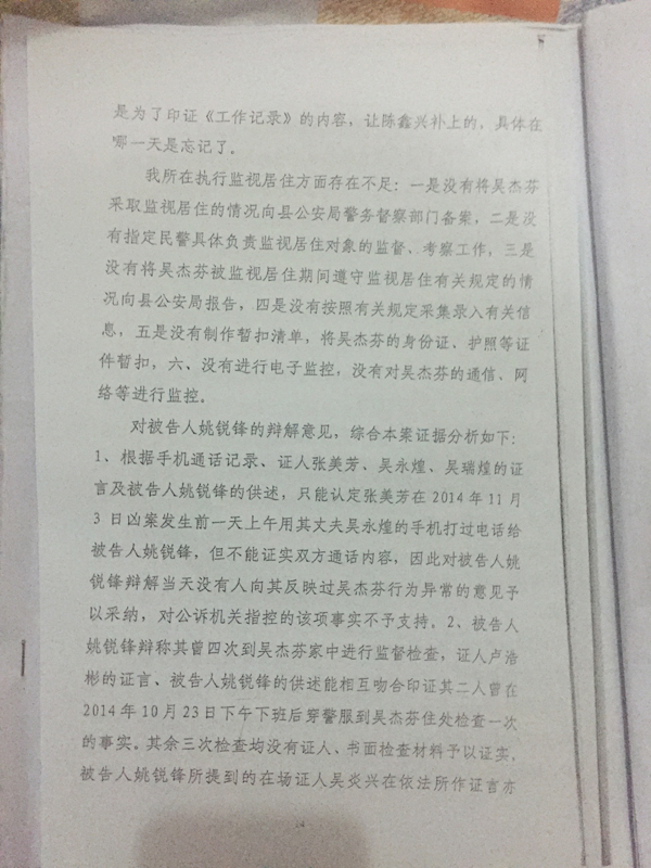 對(duì)于判決書(shū)提及的“瀆職行為”,如沒(méi)有指定民警具體負(fù)責(zé)吳杰芬監(jiān)視居住的監(jiān)管、考察工作;案發(fā)后曾偽造《監(jiān)視居住監(jiān)管工作記錄》,姚銳鋒也承認(rèn),作為轄區(qū)派出所所長(zhǎng),他的工作確實(shí)有所疏忽。
