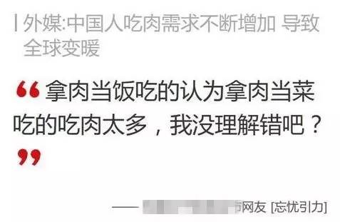 很明顯,“吃肉增多致全球變暖”比“中國人吃肉增多致全球變暖”更科學啊!又不是所有被吃出來的溫室氣體都是中國人做的,別的國家不吃肉嗎?