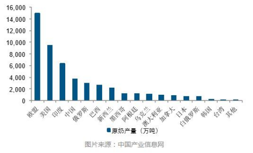 全球原奶五大主產區包括歐盟、美國、印度、中國、俄羅斯,2015年原奶產量合計為3.76億噸,占全 球原奶總產量的75%。 歐盟、美國、印度、中國、俄羅斯原奶產量分別為14960、9462、6400、3755、3055萬噸,占比分 別為30%、19%、13%、8%、6%。