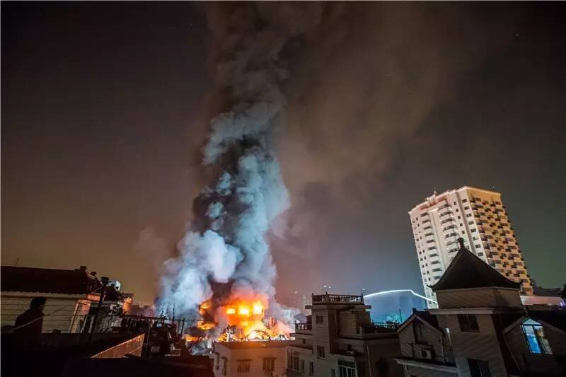 記者核實報道:火災發生在東門大廈北面的一個城中村,火勢極大,艮山西路停了40多輛消防車,僅留一個車道供東向西車輛經過,附近的艮山西路和新塘路出現大面積擁堵。圖為火勢蔓延到周邊倉庫,消防員在現場奮力撲救。