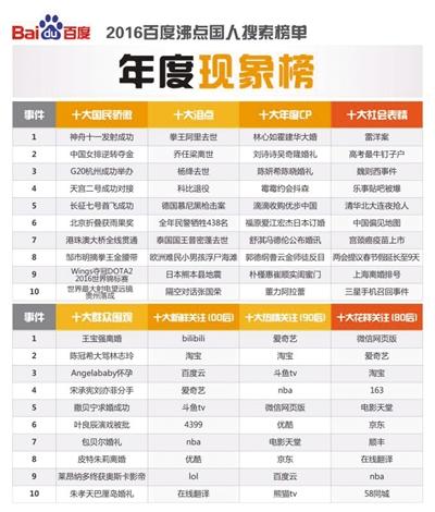 據了解,今年的百度沸點榜單整合了16億人在今年1月至11月,使用百度風云榜、百度資訊流、百度百科、百度知道、百度音樂、百度手機助手、百度手機輸入法等多個產品的數據,匯聚了2016年國人搜索熱點。