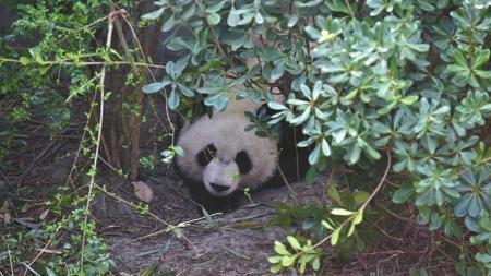 這只活潑的大熊貓叫“美奐”,是1個月前歸國的雙胞胎大熊貓中的妹妹,生性調皮好動。和它相比,姐姐“美輪”就害羞多了。一看到有生人來,“美輪”趕緊找個角落躲進樹叢,把自己遮了個嚴嚴實實。