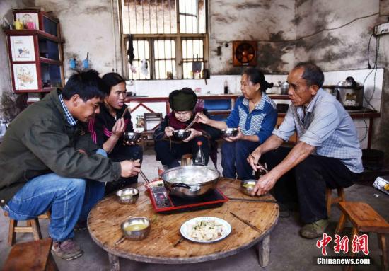 在“中國長壽之鄉”廣西桂林市恭城瑤族自治縣西嶺鄉嶺腳村,居住著目前桂林市年齡最大的長壽老人——114歲的王玉瓊。12月8日,記者探訪了這位百余歲長壽老人的生活。老人與人交談思維清晰,說話流利,還堅持每天自己打水洗澡、洗臉,自己打水洗衣服,生活自理,老人也一直有抽煙喝酒的習慣。圖為12月8日,王玉瓊與家人一起吃午餐。唐夢憲 攝