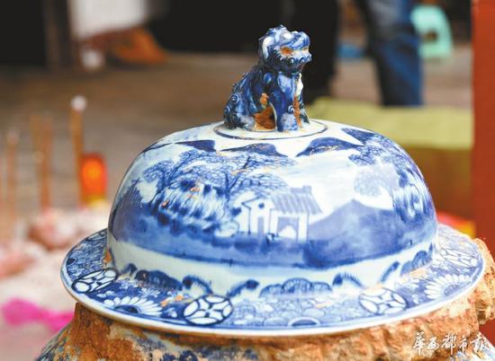 村民遷祖墳時挖出青花瓷壇 疑為清代民窯