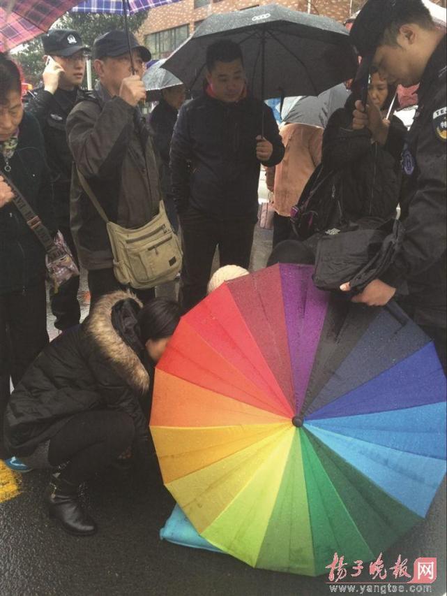 13日上午8點(diǎn)30分左右,南京北安門街發(fā)生一起交通事故,一位老太太過馬路時(shí)被一輛轎車撞倒,由于下著雨,執(zhí)行任務(wù)的特警路過此處和路人一起撐起溫暖的雨傘(如圖),隨后趕來的120將老人送往軍區(qū)總醫(yī)院救治。