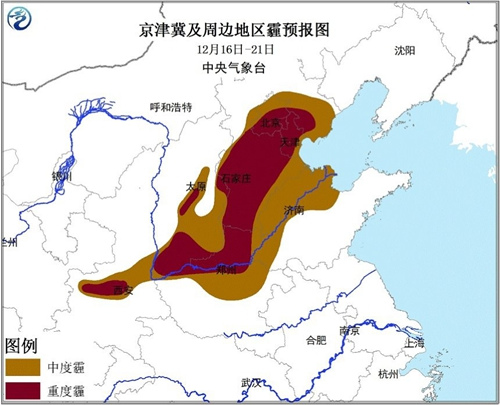 預(yù)計(jì),12月18日至21日白天,華北中南部、黃淮及陜西關(guān)中等地仍將有霾天氣,其中,北京中南部、天津大部、河北中南部、山西南部、山東西部、河南北部、陜西關(guān)中等地部分地區(qū)有重度霾,最低能見(jiàn)度可達(dá)1公里以下。