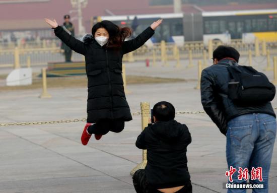 12月21日,北京持續(xù)霧霾。圖為游客在天安門廣場(chǎng)參觀。中新社記者 杜洋 攝