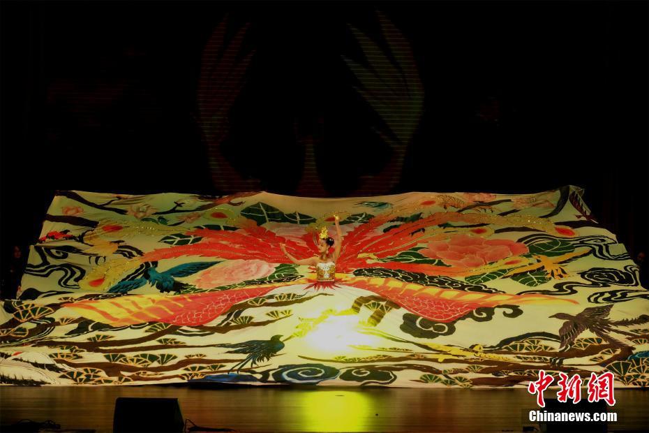 近日,在重慶理工大學會計學院年度頒獎典禮暨文藝晚會上,當晚壓軸出場的舞蹈《百鳥朝鳳圖》,令現場千余名師生贊嘆不已,發布到網上后火爆了微信朋友圈。據了解,該作品是重慶理工大學三名95后女大學生純手工打造的,從設計到制作共歷時兩個月時間,從討論到設計定稿、畫圖上色、縫制金線,再到成衣,這件《百鳥朝鳳圖》裙擺長約9米、寬約8.5米,以人身為鳳頭,裙擺為鳳翼,展開就宛如浴火重生的鳳凰一般。鐘欣 攝