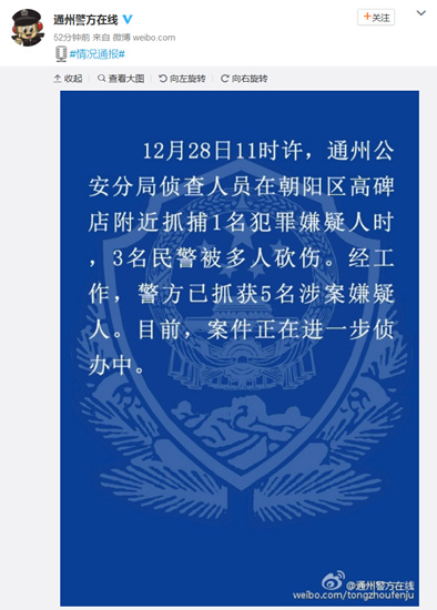 中新網12月29日電 據北京市公安局通州分局官方微博消息,12月28日11時許,通州公安分局偵查人員在朝陽區高碑店附近抓捕1名犯罪嫌疑人時,3名民警被多人砍傷。經工作,警方已抓獲5名涉案嫌疑人。