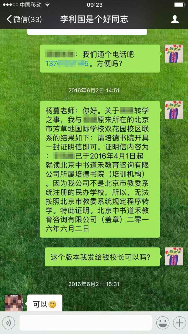 12月27日晚,錢志龍向澎湃新聞出示當時負責招生的教師和李利國的微信聊天記錄:“負責招生的老師說‘因為我公司不是北京市教委系統注冊的民辦學校,所以,無法按照北京市教師系統規定程序轉學。’李利國回復:‘可以’。”