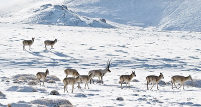 1月3日,在西藏羌塘國家級自然保護區內,一群藏羚羊正在覓食(如圖)。近年來,西藏各類自然保護區的藏羚羊種群數逐年增加,已達15萬只左右。最新版的《世界自然保護聯盟瀕危物種紅色名錄》顯示:因保護得力,藏羚羊已從“瀕!苯禐椤敖!。