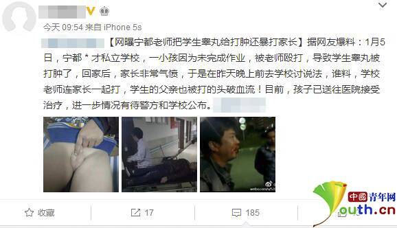 近日有網(wǎng)友爆料稱,1月5日江西寧都某私立學(xué)校一學(xué)生因作業(yè)未完成,睪丸被老師打腫,學(xué)生父親在去學(xué)校交涉時(shí)也被老師打的頭破血流,目前孩子已送往醫(yī)院接受治療。1月7日下午,該校老師告訴中國青年網(wǎng)記者,網(wǎng)上流傳的內(nèi)容皆為不實(shí)消息,真實(shí)情況是該校老師被家長(zhǎng)手鋼管毆打,目前當(dāng)?shù)毓簿忠呀槿氪耸隆?/p>