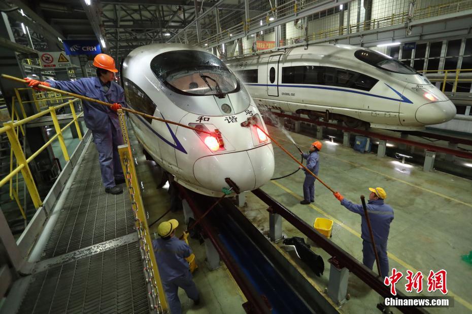1月8日晚,一列和諧號高鐵列車緩慢駛入上海虹橋動車運用所,車頭部分沾滿了厚厚的“霧霾妝”,在列車入庫前除了對外皮自動清洗外,車頭部分還需人工特別精洗“卸妝”,一趟400米的長編列車清洗完畢大約需要45分鐘,每組工人一晚要清洗20多個“霧霾車頭”,直到清晨。圖為工作人員為高鐵車頭洗刷刷。中新社記者 張亨偉 攝