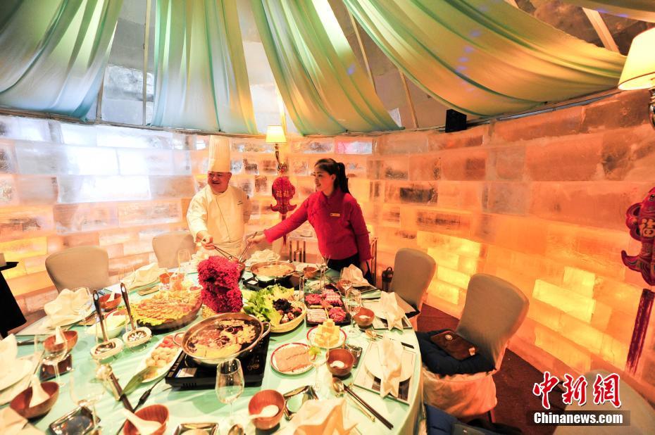 1月11日,遼寧沈陽,冰屋火鍋餐廳。當日,沈陽一酒店推出冰屋火鍋餐廳,在冰屋吃火鍋讓食客在冰屋體驗冰火兩重天的奇妙感覺。 中新社記者 于海洋 攝