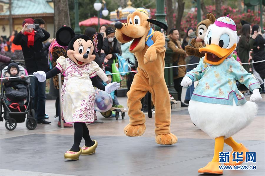 1月11日,迪士尼卡通人物在巡游表演中載歌載舞。臨近春節,上海迪士尼園區內洋溢著濃濃的“年味兒”。 新華社記者 丁汀 攝