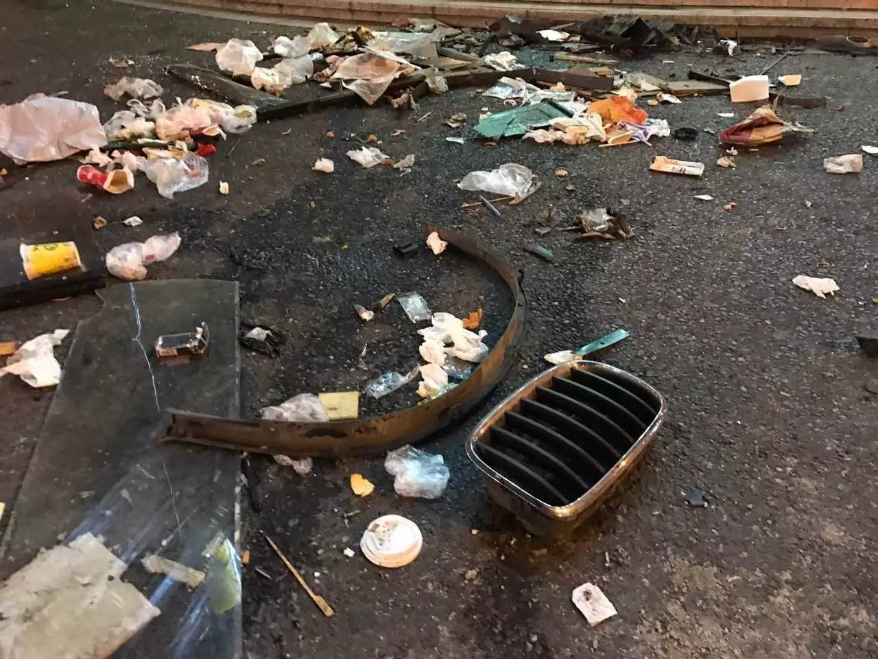 錢江晚報記者趕到現場時,受損車輛均已經被拉走,但是現場狼藉慘狀,依然能感受當時撞擊有多厲害。在現場,靠近中山北路和文暉路交叉口西南側一角,堆放著還沒處理的碎片,里面有變形的自行車,被撞斷的護欄鐵柱,車子上的各種配件。