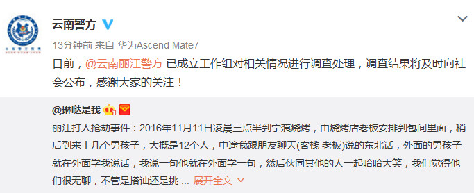 中新網(wǎng)1月25日電 24日,有網(wǎng)友發(fā)微博稱2016年11月在麗江旅游期間,被一群陌生人暴打。云南省公安廳官方微博今日轉(zhuǎn)發(fā)該網(wǎng)友微博并回應(yīng),稱麗江市公安局已成立工作組對相關(guān)情況進(jìn)行調(diào)查處理,調(diào)查結(jié)果將及時(shí)向社會(huì)公布。